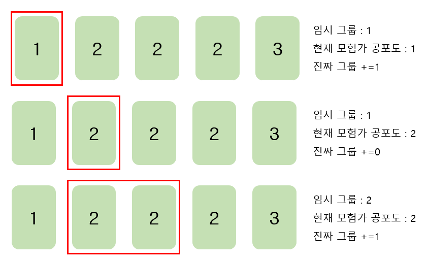 - 순서대로 한명 씩 임시 그룹에 추가하고, 임시 그룹의 인원수가 현재 들어온 모험가의 공포도 보다 크거나 같다면 진짜 그룹을 형성한다.